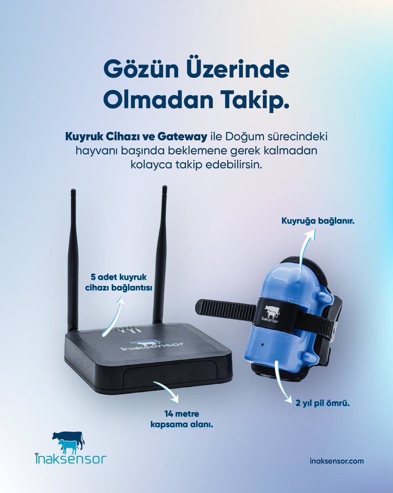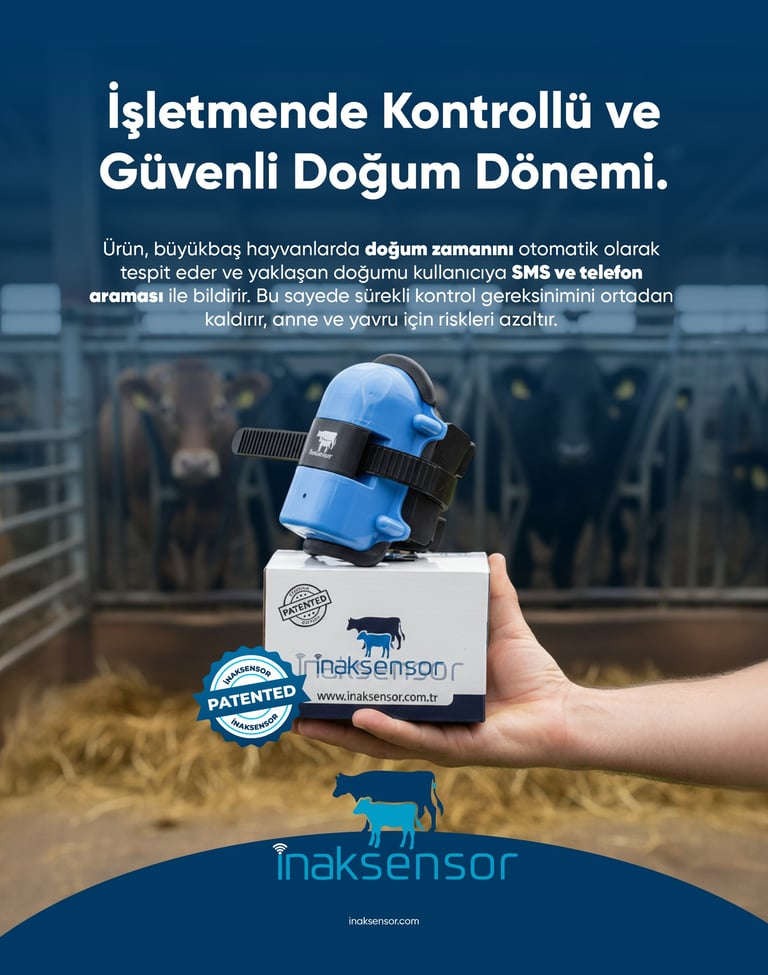 Büyükbaş hayvancılıkta doğum süreci, zamanında müdahale gerektiren en kritik aşamalardan biridir. Sürekli kontrol ihtiyacı hem iş yükünü artırır hem de gözden kaçan anlarda ciddi kayıplara yol açabilir. Bu sistem, büyükbaş hayvanlarda doğum sürecini otomatik olarak takip eder ve doğum yaklaşınca (yaklaşık 1 saat öncesinde) kullanıcıyı SMS ve otomatik arama ile bilgilendirir. Böylece işletmeler kontrol yükünden kurtulur, doğum anına zamanında müdahale ederek anne ve yavru güvenliğini artırır. Kolay kurulum, uzun pil ömrü ve bakım sonrası tekrar kullanım avantajıyla sistem, hayvancılık yapan herkes için pratik ve güvenilir bir çözümdür.